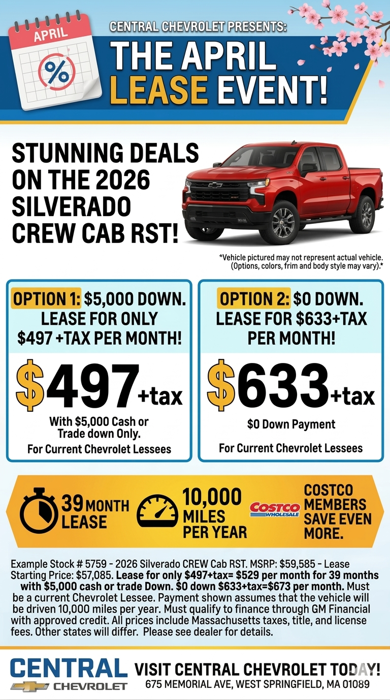 Example Stock # 5759 - 2026 Silverado CREW Cab RST MSRP: $59,585 - Lease Starting Price: $57,085. Lease for only $497+tax= $529 per month for 39 months with $5,000 cash or trade Down. If you are a Costco member you can SAVE EVEN MORE. Must be a current Chevrolet Lessee. Payment shown assumes that the vehicle will be driven 10,000 miles per year. $0 down $633+tax=$673 per month. Must qualify to finance through GM Financial with approved credit. All prices include Massachusetts taxes, title, and license fees. Other states will differ. Vehicle pictured may not represent actual vehicle. (Options, colors, trim and body style may vary). Please see dealer for details.