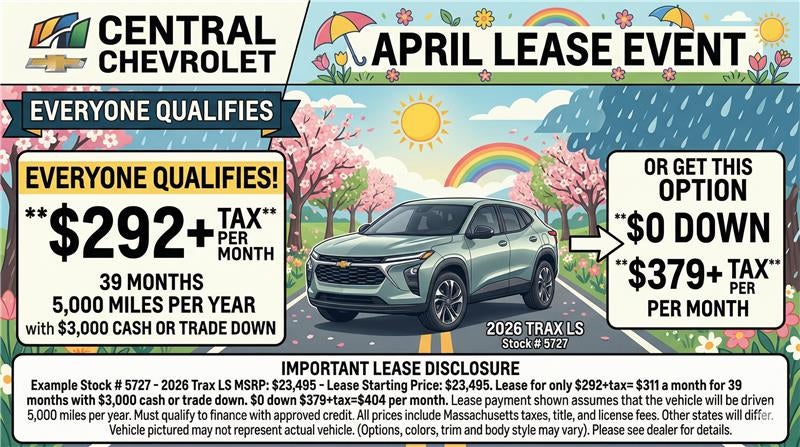 Example Stock # 5727 - 2026 Trax LS MSRP: $23,495 - Lease Starting Price: $23,495. Lease for only $292+tax= $311 a month for 39 months with $3,000 cash or trade down. $0 down $379+tax=$404 per month. Lease payment shown assumes that the vehicle will be driven 5,000 miles per year. Must qualify to finance with approved credit. All prices include Massachusetts taxes, title, and license fees. Other states will differ. Vehicle pictured may not represent actual vehicle. (Options, colors, trim and body style may vary). Please see dealer for details.
